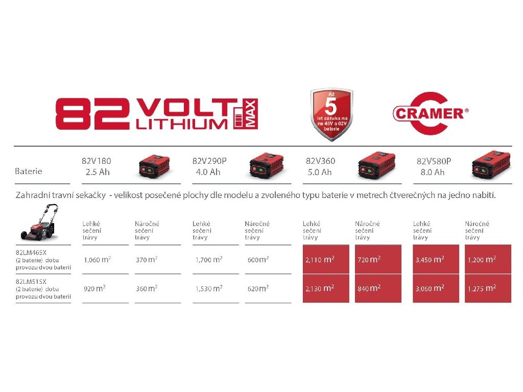 Pouze rozbaleno, 100% stav, originální obal.AKCE obsahuje: Travní sekačka CRAMER 82LM46SX Baterie 82V360 - 82V, 5Ah 360 Wh + Bluetooth s 5-letou zárukouRychlonabíječka 82C1G - 82V 1 slot 4Ah Cramer je profesionální značka společnosti Globe Technologies, jednoho z předních světových výrobců bateriového nářadí a zahradního vybavení. S více než 6 000 zaměstnanci po celém světě a s více než 600 inženýry společnost neustále vyvíjí nové produkty v Severní Americe a Evropě. Celkem 96% produktových komponentů je vyráběno ve vlastních prostorech společnosti. Produktová řada Cramer nabízí působivě výkonné bateriové systémy, ergonomický design a udržitelnost ve prospěch životního prostředí a vytvoření zelenějšího světa. Produkty Cramer 82V pro zahradnictví a údržbu krajiny využívají efektivní a inovativní 82V bateriový systém, poskytující vysoký výkon pro profesionální použití. Cramer je globálním hráčem na trhu. Ale mozek je ve Švédsku. Všechny produkty Cramer jsou navrženy a vyvinuty v našem výzkumném a vývojovém zařízení v Jönköpingu. Předností je švédská odbornost. 82V BATERIOVÝ PROGRAM - Správný výkon pro profesionály Cramer výrobky z řady 82V poskytují větší výkon s menším proudem než komerčně dostupné systémy s nižším napětím. Nižší proud znamená, že bateriové články nemusí pracovat na maximální úrovni. To generuje méně tepla, zvyšuje účinnost a životnost baterie. A snížení rizika náhlých přerušení v důsledku přehřátí článků a motorů. Bateriový systém Cramer 82V dodává potřebný výkon a je připraven na budoucnost pro ještě vyšší výkon. S výrobky Cramer 82V můžete vždy získat vysoký výkon na rozdíl od nízkonapěťových systémů. Cramer 82LM46SX 82V AKU profesionální sekačka na trávu s vlastním pohonem Bateriové sekačky na trávu Cramer 82V nabízejí špičkový výkon s vynikající kvalitou sečení pro dokonalý trávník. Tato sekačka má slot na dvě baterie pro delší dobu provozu. Optimalizovaný systém sběru zajišťuje, že na zemi nezůstanou žádné zbytky trávy. Stručně řečeno: Cramer vám umožní sekat trávníky rychle, tiše a perfektně. Hlavní výhody modelu 82LM46SX 82V AKU - Prodlužte dobu provozu pomocí funkce automatického přepínání baterie - Pracujte efektivněji díky velké šířce záběru - 82V technologie srovnatelná s 140 ccm benzínovou sekačkou, přesto má výrazně nižší provozní náklady - Automatické přidání výkonu zvýší rychlost nože v náročných travnatých podmínkách - automatické zrychlení (Boost) zvýší rychlost otáček nože, když sekáte hustou nebo vysokou trávu - IPX4 - odolnost vůči všem povětrnostním vlivům