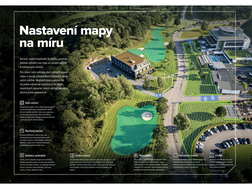 Díky integrované umělé inteligenci zná AiConic vždy svou přesnou polohu a vypočítá nejefektivnější dráhu sečení pro pokrytí oblasti. AiConic je připojen k aplikaci pro předpověď deště a mrazu, což zajišťuje, že sekačka funguje pouze tehdy, když jsou vhodné podmínky pro sečení trávy.