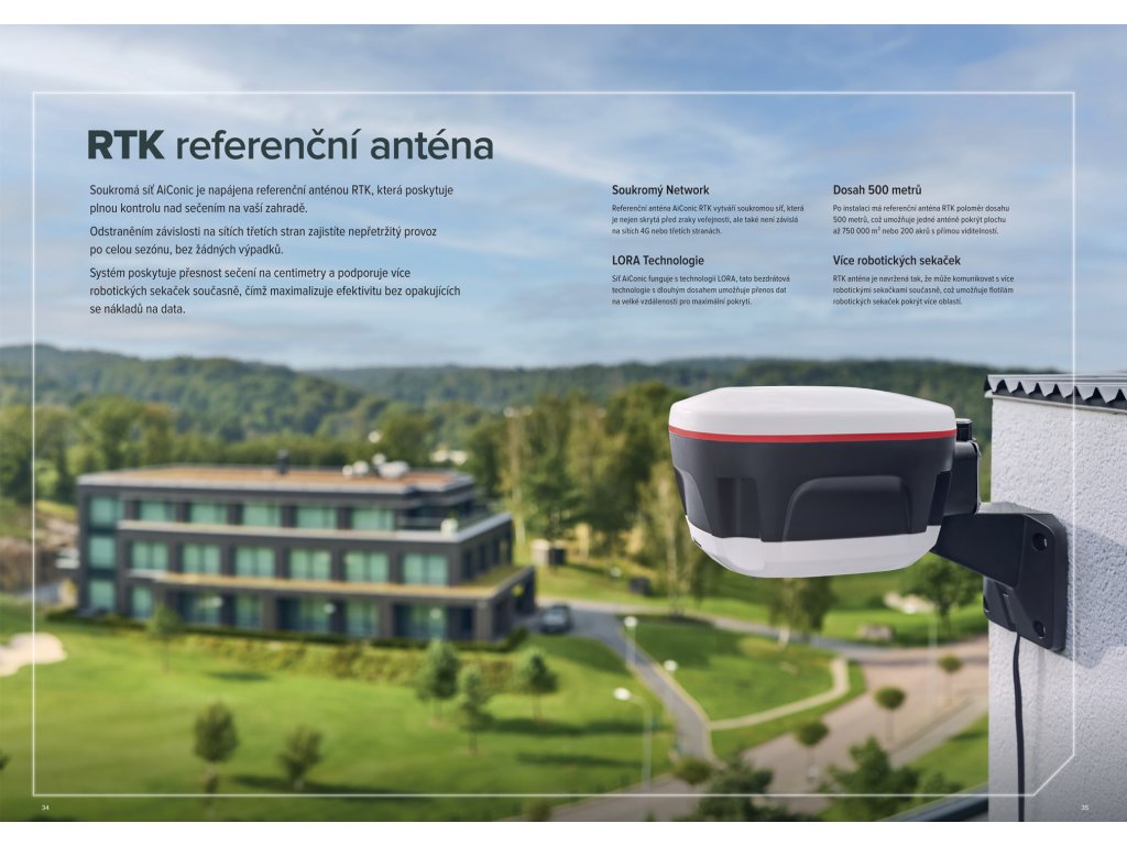 Referenční anténa přijímá satelitní signály a odesílá korekční data do sekačky, aby bylo dosaženo umístění s přesností na cm. Data jsou přenášena z referenční antény do sekačky prostřednictvím signálu LoRa (Long Range).