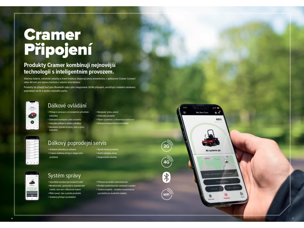 Produkty Cramer kombinují nejnovější technologii s inteligentním provozem. Všechny baterie, veškerá robotika a všechny sekačky disponují plnou konektivitou s aplikací Cramer Connect pro úplnou kontrolu z vašeho chytrého telefonu. Produkty lze připojit buď přes Bluetooth, nebo přes integrované 2G/4G připojení.