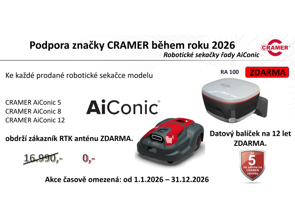 Prodloužení obecné záruky výrobce ze 3 let na 5 let pro zákazníky, kteří si zakoupí robotickou sekačku AiConic 3, 5, 8 nebo 12 a zaregistrují se online na https://cramertools-service.com do 2 měsíců od data nákupu. Rozšířená záruka na 5 let, platí pouze v případě splnění každoročního placeného zimního servisu.