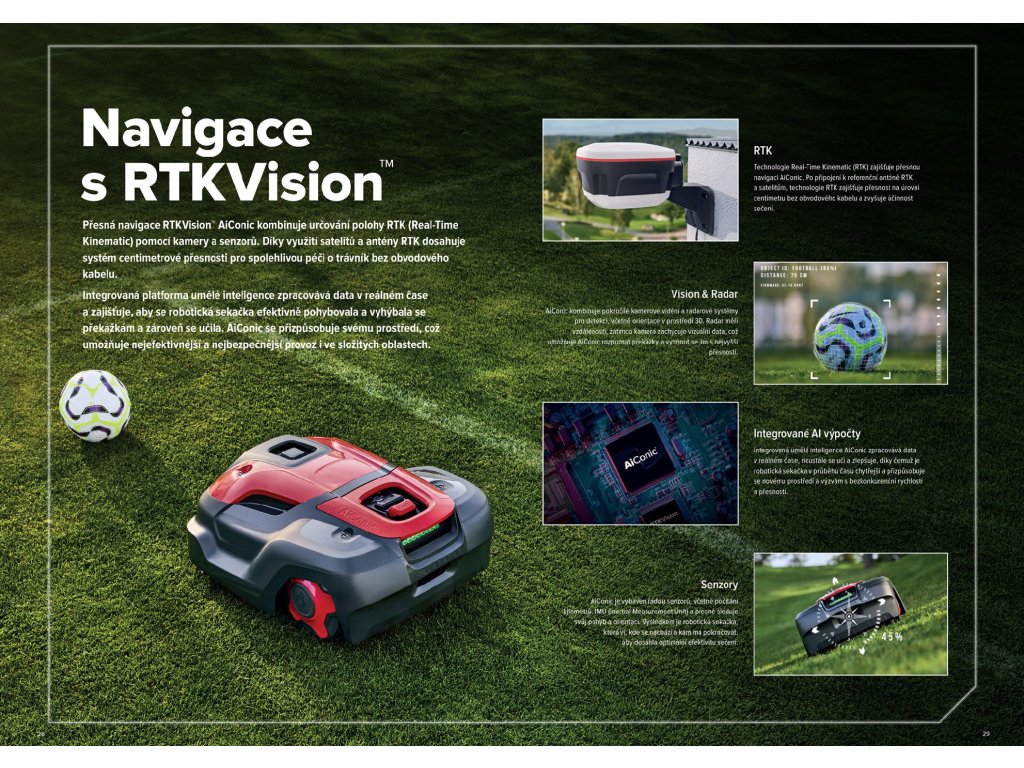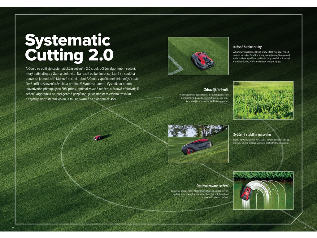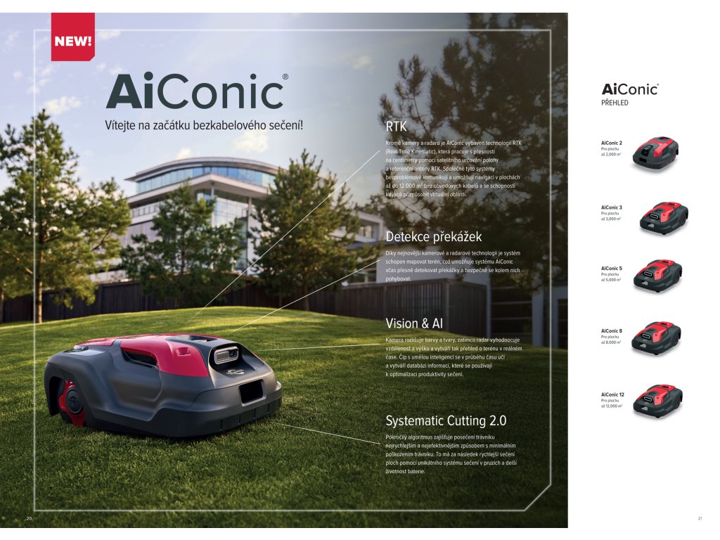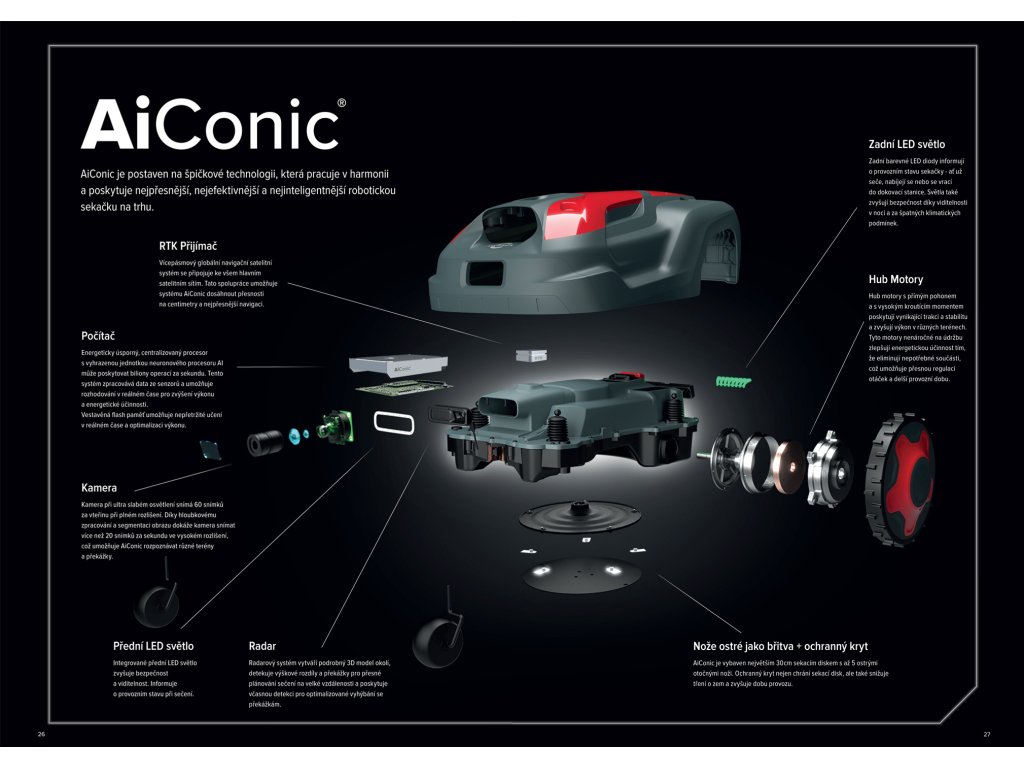 Díky integrované umělé inteligenci zná AiConic vždy svou přesnou polohu a vypočítá nejefektivnější dráhu sečení pro pokrytí oblasti. AiConic je připojen k aplikaci pro předpověď deště a mrazu, což zajišťuje, že sekačka funguje pouze tehdy, když jsou vhodné podmínky pro sečení trávy.