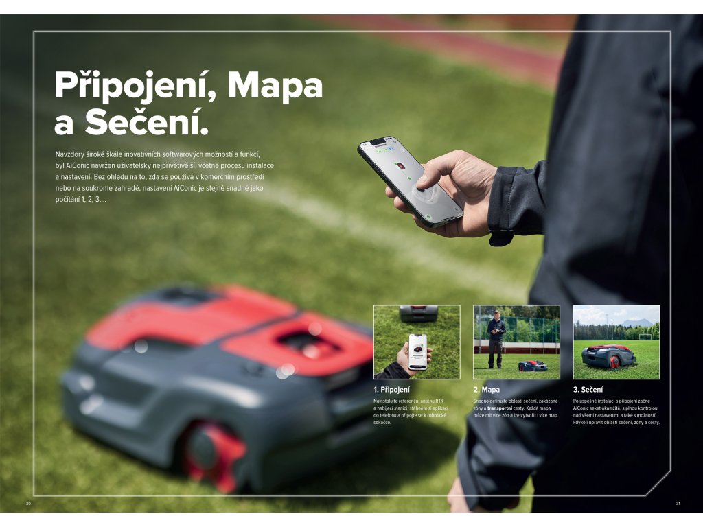 Díky integrované umělé inteligenci zná AiConic vždy svou přesnou polohu a vypočítá nejefektivnější dráhu sečení pro pokrytí oblasti. AiConic je připojen k aplikaci pro předpověď deště a mrazu, což zajišťuje, že sekačka funguje pouze tehdy, když jsou vhodné podmínky pro sečení trávy.