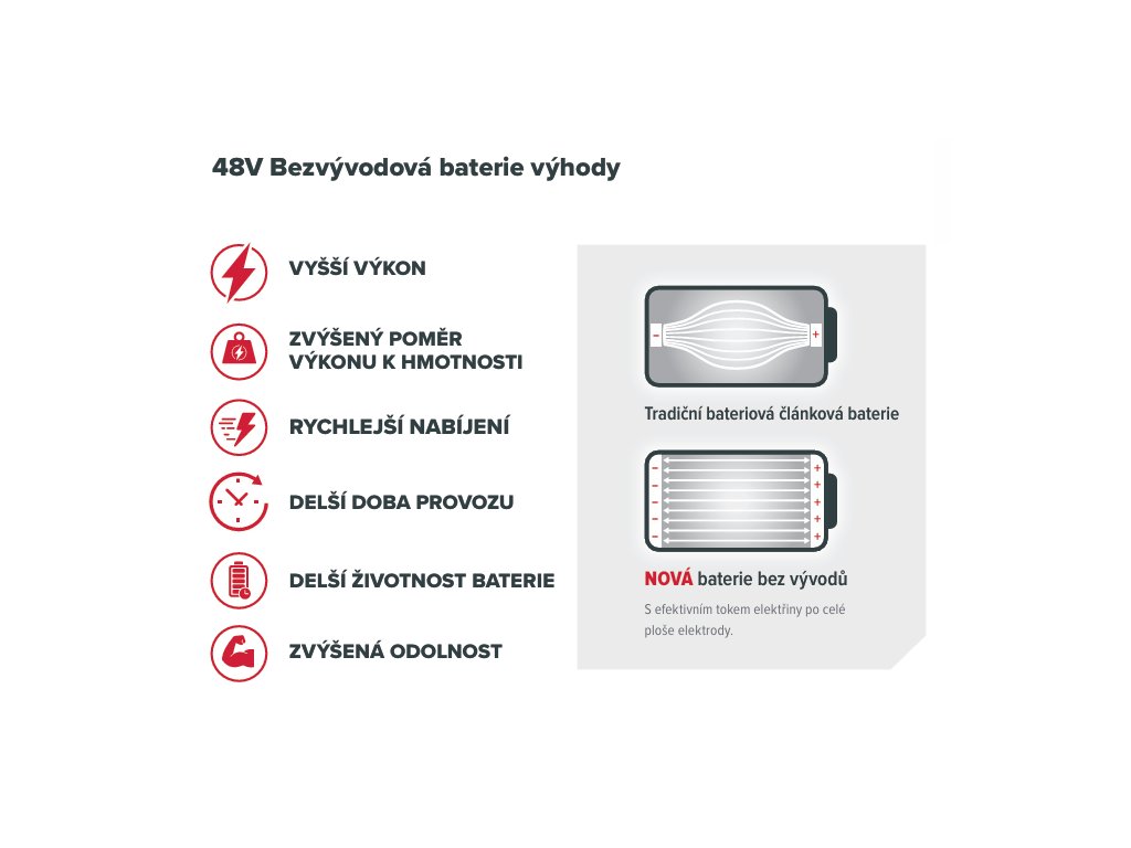 Modely 48BT216 a 48BT170 představují nejnovější inovaci v oblasti bateriových technologií pro zahradní techniku, nyní s technologií bezvývodové konstrukce článků.