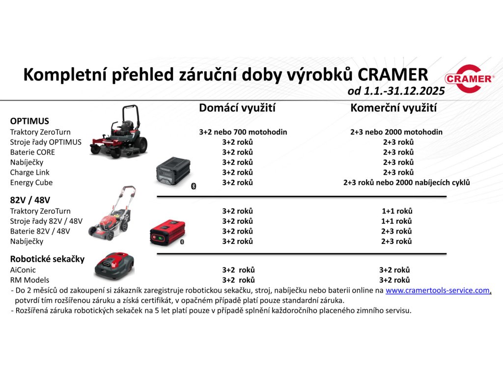 Pouze rozbaleno, 100% stav, originální obal.AKCE obsahuje: Plotostřih CRAMER 82HT61 82V Baterie 82V180 - 82V, 2.5Ah 180 Wh + Bluetooth s 5-letou zárukouRychlonabíječka 82C1G - 82V 1 slot 4Ah Cramer je profesionální značka společnosti Globe Technologies, jednoho z předních světových výrobců bateriového nářadí a zahradního vybavení. S více než 6 000 zaměstnanci po celém světě a s více než 600 inženýry společnost neustále vyvíjí nové produkty v Severní Americe a Evropě. Celkem 96% produktových komponentů je vyráběno ve vlastních prostorech společnosti. Produktová řada Cramer nabízí působivě výkonné bateriové systémy, ergonomický design a udržitelnost ve prospěch životního prostředí a vytvoření zelenějšího světa. Produkty Cramer 82V pro zahradnictví a údržbu krajiny využívají efektivní a inovativní 82V bateriový systém, poskytující vysoký výkon pro profesionální použití. Cramer je globálním hráčem na trhu. Ale mozek je ve Švédsku. Všechny produkty Cramer jsou navrženy a vyvinuty v našem výzkumném a vývojovém zařízení v Jönköpingu. Předností je švédská odbornost. 82V BATERIOVÝ PROGRAM - Správný výkon pro profesionály Cramer výrobky z řady 82V poskytují větší výkon s menším proudem než komerčně dostupné systémy s nižším napětím. Nižší proud znamená, že bateriové články nemusí pracovat na maximální úrovni. To generuje méně tepla, zvyšuje účinnost a životnost baterie. A snížení rizika náhlých přerušení v důsledku přehřátí článků a motorů. Bateriový systém Cramer 82V dodává potřebný výkon a je připraven na budoucnost pro ještě vyšší výkon. S výrobky Cramer 82V můžete vždy získat vysoký výkon na rozdíl od nízkonapěťových systémů. Cramer Optimus 82HT61 plotostřih Cramer vám nabízí ten správný bateriový plotostřih pro různé použití dokonale vyvážený s vysokým výkonem, ale bez benzínových výparů. Stříhejte živé ploty bez námahy pomocí 82HD75, 82HD62 nebo 82HD61. Cramer 82HD62 a 82HD75 jsou připraveny pro použití s bateriemi nošenými na těle, což minimalizuje hmotnost plotostřihu pro pohodlnou práci bez únavy po celý den. Plotostřih je vybaven vypínačem s proměnnou rychlostí, která umožňuje úplnou kontrolu nad prací a prodlužuje životnost baterie. Přidání funkce zpětného chodu zabraňuje zaseknutí v tvrdším materiálu a postup spouštění dvěma tlačítky zabraňuje náhodnému spuštění pro větší bezpečnost. Plotostřihy mají vysoce kvalitní magneziovou skříň převodovky pro maximální odolnost. Hlavní výhody modelu 82HT61 - Baterie se vkládají přímo do plotostřihu, což umožňuje