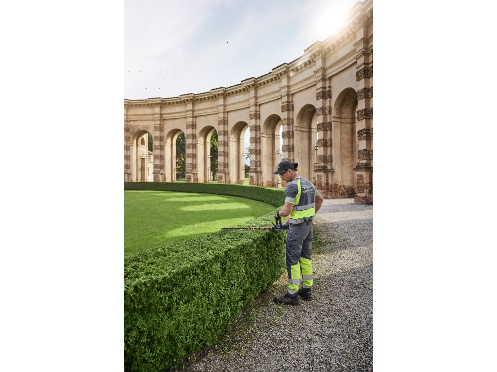 - Vysoce ergonomické s vyváženou hmotností baterie mezi přední a nastavitelnou zadní rukojetí pro snížení namáhání paží obsluhy