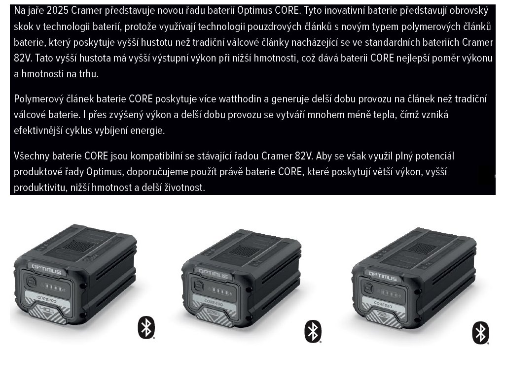 Pouze rozbaleno, 100% stav, originální obal.CRAMER OPTIMUS TB13H Cramer je profesionální značka společnosti Globe Technologies, jednoho z předních světových výrobců bateriového nářadí a zahradního vybavení. S více než 6 000 zaměstnanci po celém světě a s více než 600 inženýry společnost neustále vyvíjí nové produkty v Severní Americe a Evropě. Celkem 96% produktových komponentů je vyráběno ve vlastních prostorech společnosti. Produktová řada Cramer nabízí působivě výkonné bateriové systémy, ergonomický design a udržitelnost ve prospěch životního prostředí a vytvoření zelenějšího světa. Produkty Cramer 82V pro zahradnictví a údržbu krajiny využívají efektivní a inovativní 82V bateriový systém, poskytující vysoký výkon pro profesionální použití. Cramer je globálním hráčem na trhu. Ale mozek je ve Švédsku. Všechny produkty Cramer jsou navrženy a vyvinuty v našem výzkumném a vývojovém zařízení v Jönköpingu. Předností je švédská odbornost. 82V BATERIOVÝ PROGRAM - Správný výkon pro profesionály Cramer výrobky z řady 82V poskytují větší výkon s menším proudem než komerčně dostupné systémy s nižším napětím. Nižší proud znamená, že bateriové články nemusí pracovat na maximální úrovni. To generuje méně tepla, zvyšuje účinnost a životnost baterie. A snížení rizika náhlých přerušení v důsledku přehřátí článků a motorů. Bateriový systém Cramer 82V dodává potřebný výkon a je připraven na budoucnost pro ještě vyšší výkon. S výrobky Cramer 82V můžete vždy získat vysoký výkon na rozdíl od nízkonapěťových systémů. Cramer OPTIMUS TB13H křovinořez TB13H je jedním z nejsilnějších a nejvýkonnějších bateriových křovinořezů na trhu. Model TB13H obsahuje standardní strunovou hlavu a žací nůž. Nový model TB13H je lehký, výkonný profesionální křovinořez, který nabízí skvělou manévrovatelnost pro náročnější vyžínací práce díky ergonomickým Bike řídítkům a funkci variabilní rychlosti. Bezkomutátorový motor Cramer může dodávat až 1,45 kW, což je srovnatelné s benzínovým motorem o objemu 30 ccm. Model TB13H je vyroben z prvotřídních komponent včetně optimalizované magneziové hlavy motoru pro větší odolnost a snadnou obsluhu. Hlavní výhody modelu OPTIMUS TB13H - Výkonný bezkomutátorový motor o výkonu 1,45 kW, srovnatelný s benzínovým motorem o objemu 30 ccm, v kombinaci se silnou převodovkou poskytuje vysoký krouticí moment pro náročné podmínky - Plně nastavitelná řidítka a ergonomický postroj pro zajištění pohodlí obsluhy při dlouhodobém používání - Nabízí výjimečnou odolnost díky robustní konstrukci a použití magneziových složek - Prémiová strunová žací hlava s nárazovým odvinutím má šířku sečení 43cm, pro rychlé vyžínání trávy, zatímco ocelový nůž křovinořezu o průměru 300mm si poradí i s odolnější zarostlou plochou - Trojí nastavení rychlosti a variabilní spoušť umožňují výkon až 5 500 ot./min. - Vyvážená konstrukce TB13H umožňuje vysokou manévrovatelnost při práci - Hmotnost 5,5kg (bez baterie) pro výjimečný poměr výkonu a hmotnosti - Efektivní a bezúdržbový díky bezkomutátorovému motoru - Magneziová skříň převodovky zvyšuje odolnost - Nízké vibrace snižují namáhání a únavu končetin při dlouhé práci - Ergonomicky optimalizovaný úhel hlavy Technická specifikace: Motor: Bezkomutátorový