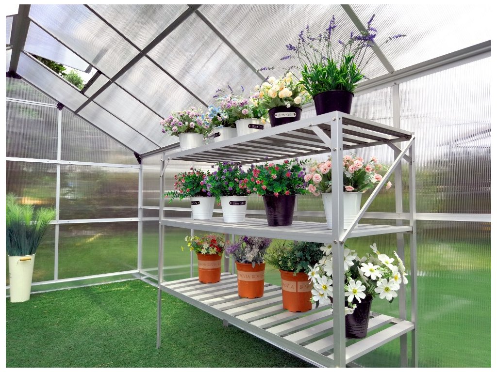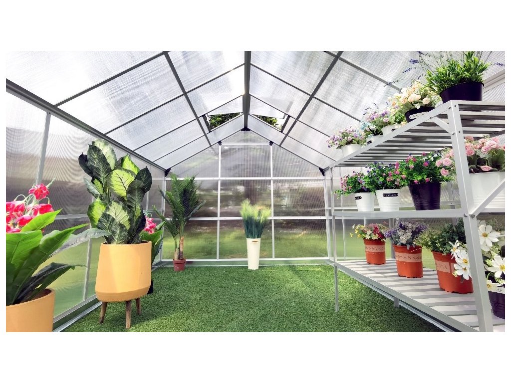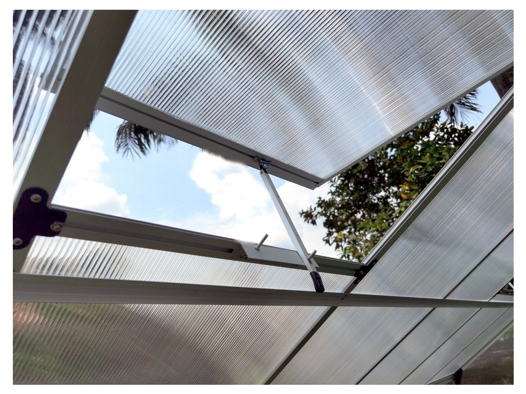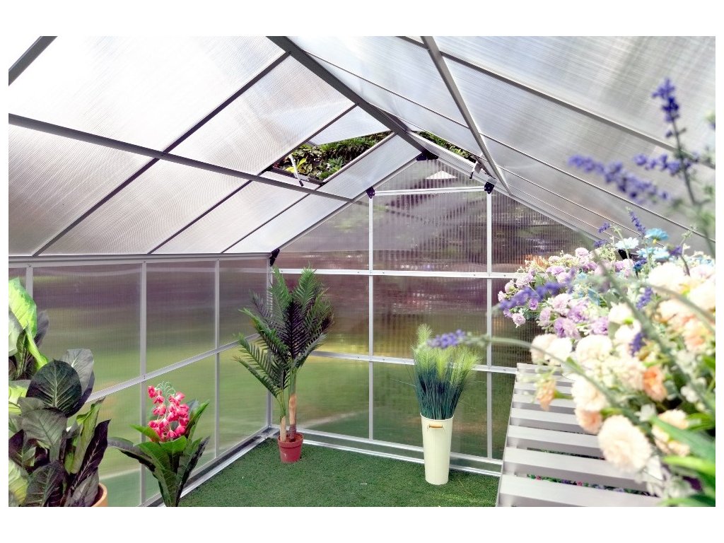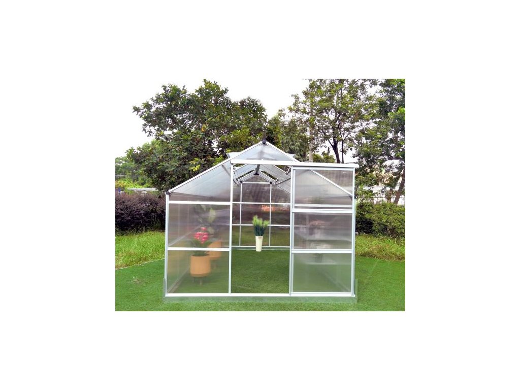 Hliníkový skleník VeGA 9500 STRONG-22 Zesílená hliníková konstrukce 4x střešní okno 1x posuvné dveře Dvoustěnný komůrkový polykarbonát 4mm s UV filterm Zesílený nosný profil Hlubší drážka pro zasunutí PKD 10 mm Plocha 8,9 m2 Výška skleníku 208 cm včetně základny Základna ZDARMA Výhoda: drážkové uchycení polykarbonátu Rozměry skleníku: š.245 x d.363 x v.208cm Ke skleníkům VeGA je dodávána pozinkovaná základna ZDARMA. Speciální drážková konstrukce skleníků VeGA je vyrobena ze zesílených eloxovaných hliníkových profilů. Jedná se o moderní dokonalé řešení s hlubší drážkou 10 mm pro zasunutí polykarbonátových desek, které zásadně zvýšilo celkovou pevnost a stabilitu celého skleníku. Oproti zastaralému drátkovému systému, který se už téměř moc nepoužívá, se zároveň zvýšila i odolnost skleníku vůči nárazům větru a sněhové zátěži. Na prosklení je použito velice kvalitních tepelně-izolačních dvoustěnných komůrkových polykarbonátových desek o síle 4 mm a s UV slunečním filtrem. Skleníkům této celé modelové řady VeGA je zdarma dodávána masivní pozinkovaná základna sloužící pro bezproblémové používání skleníku i bez pevného základu. Výška skleníku se základnou je 208 cm a je koncipována pro běžné evropské uživatele. Podle kterých kritérií jsme vybírali: Skleníky jsme vybírali velice pečlivě na základě podmětů ze stran uživatelů i potencionálních zákazníků a zároveň čerpali ze svých zkušeností a prodejů tisíců skleníků z minulých období. Základem každého kvalitního polykarbonátového skleníku je pevná konstrukce z eloxovaných zesílených hliníkových profilů a kvalitní polykarbonát. Naše skleníky VeGA a Komfort jsou osazeny kvalitním tepelně-izolačním dvoustěnným komůrkovým polykarbonátem s UV slunečním filtrem o síle desek 4 a 6 mm. Dalším podstatným stavebním bodem každého skleníku je konstrukční spojení polykarbonátových desek s hliníkovou nosnou konstrukcí. Skleníky VeGA a Komfort mají speciální drážkovou konstrukci, jedná se o moderní dokonalé řešení, které zásadně zvýšilo celkovou pevnost a stabilitu celého skleníku. Oproti zastaralému drátkovému systému, který se už téměř moc nepoužívá, se zároveň zvýšila i odolnost skleníku vůči nárazům větru a sněhové zátěži. Ke skleníkům je zdarma dodávána masivní pozinkovaná základna sloužící pro bezproblémové používání skleníku i bez pevného základu. Velice nadstandardní výška skleníků se základnou 191-250 cm dle modelů je koncipována pro běžné evropské uživatele, kteří mají rádi dostatečný prostor a užitkový komfort. Dále jsme s výrobcem vyjednali úpravy pro navýšení počtu oken na sklenících a zároveň přiobjednali více oken k jednotlivým modelům, kdy jak sami dobře víte, že správné a dostatečné odvětrání je tím podstatným bodem pěstitelského úspěchu. Dalším kritériem našich zákazníků byla větší šířka skleníků, proto jsme se rozhodli vyjít těmto potřebám vstříc a nabízíme modely rozšířené a to od 184 do 281 cm šíře.Doplňkové parametry