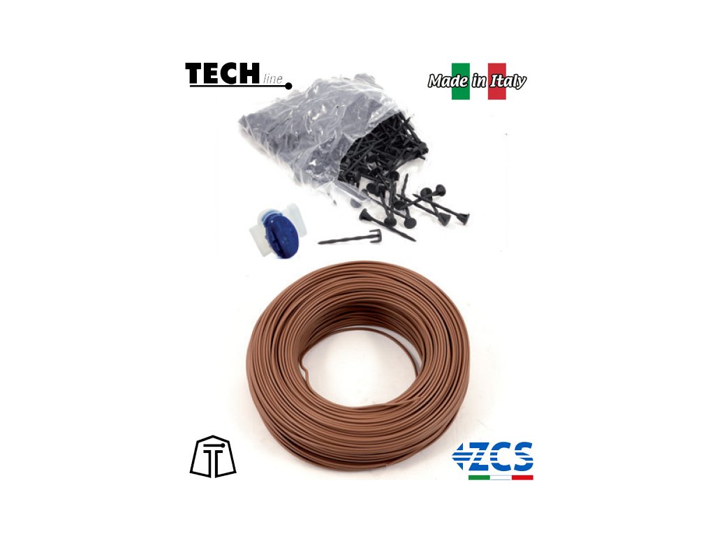 150m kabelu o průměru 3mm, 300ks hřebů, 3ks konektorů.