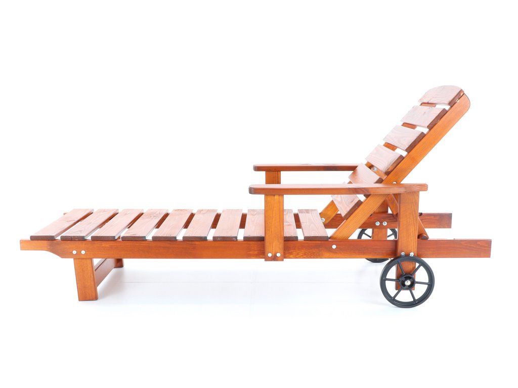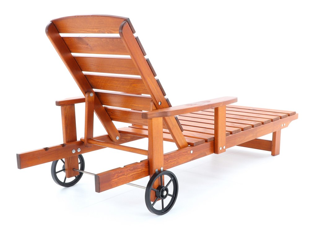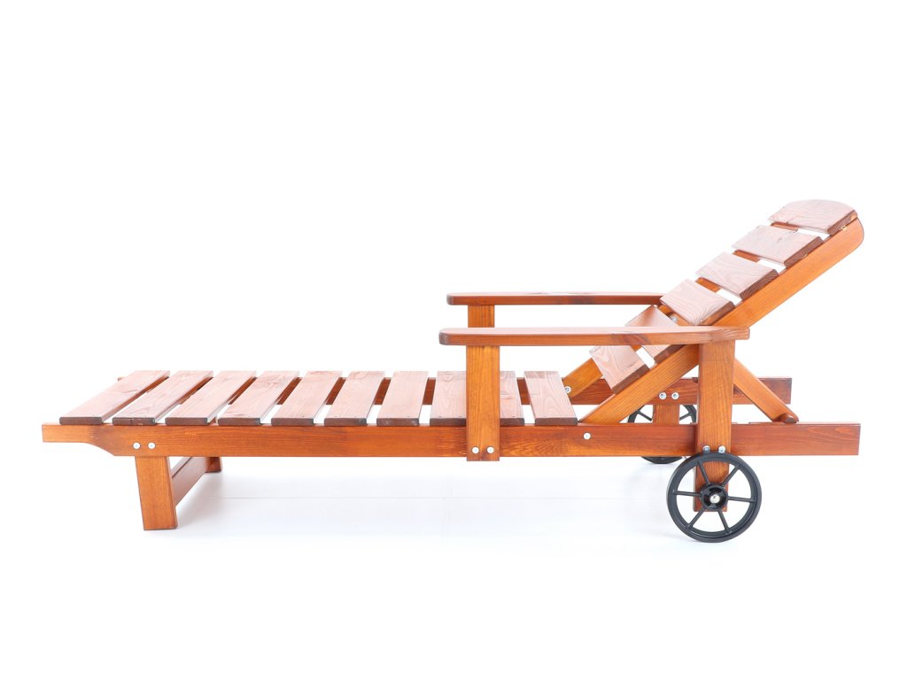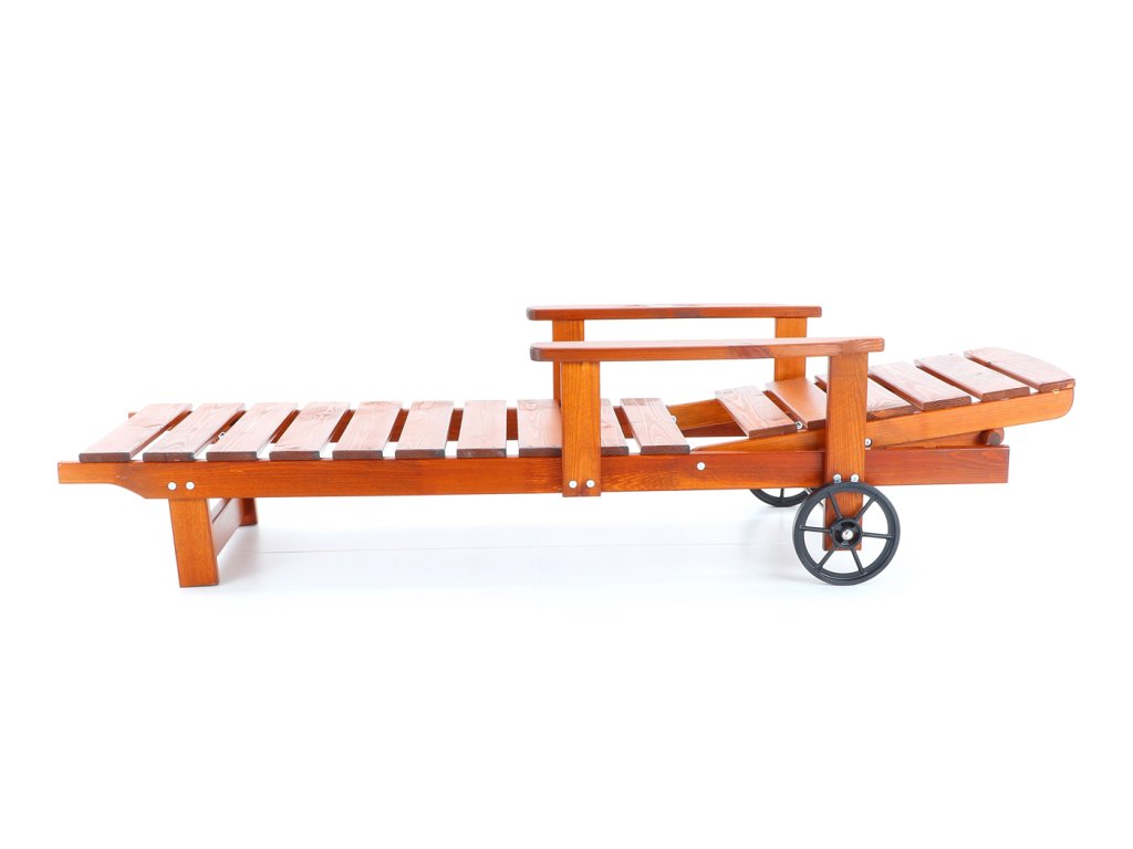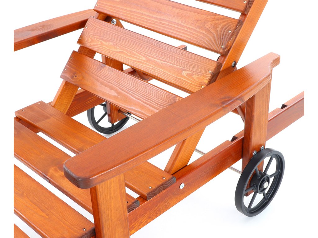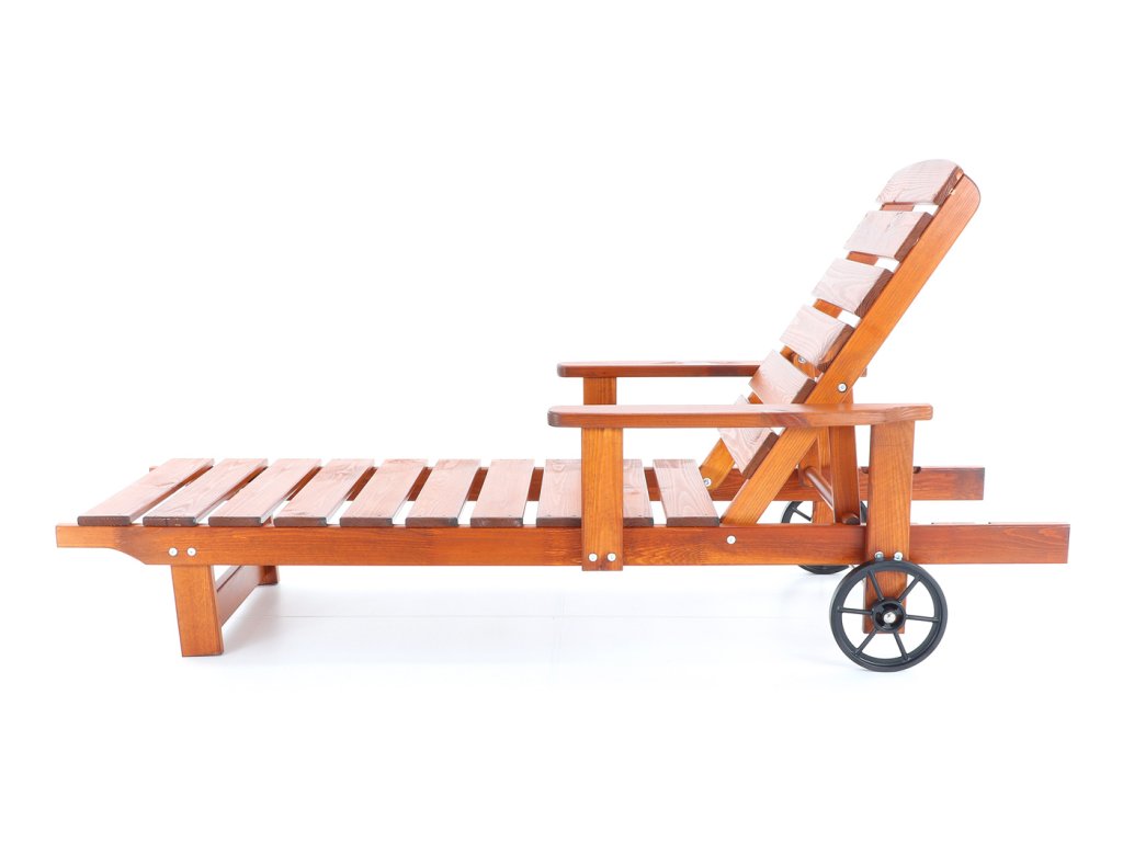 Polohovatelné dřevěné lehátko VeGA OSCAR, je vyrobeno z mořené severské borovice, povrchově ošetřena vodní lazurou. Určeno do exteriérů, interiérů a pergolových prostor. Lehátko je včetně pohodlných područek a přepravních koleček.