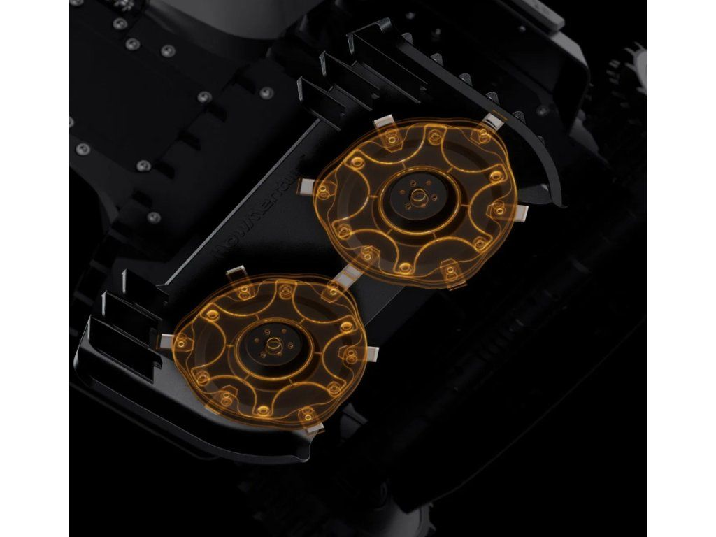 Model X-450E AWD je vybaven systémem dvojitého odpružení, který byl speciálně vyladěn pro pohyb v náročném terénu (ORV). Bez námahy tak zvládá jakýkoliv složitý povrch – od kamenných cest a vysokých obrubníků až po terénní výmoly. Tato robustní konstrukce zajišťuje stabilní stoupání a bezproblémové překračování překážek, čímž zaručuje plynulý průběh práce i tam, kde by standardní robotické sekačky uvízly.