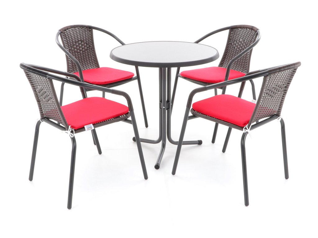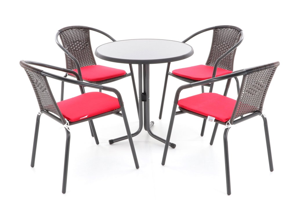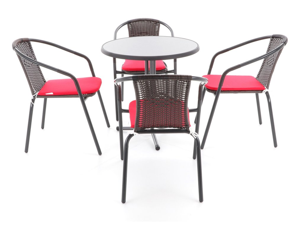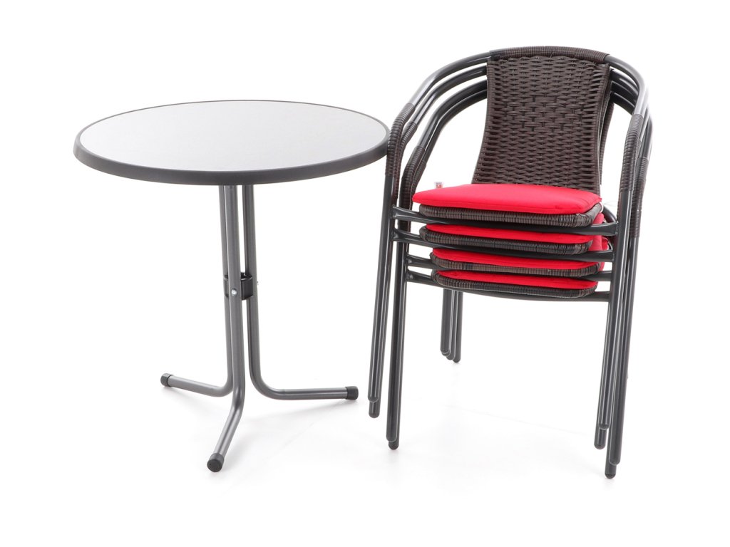 Terasový set KARO 4 se skládá z pohodlných stohovatelných křesel. Materiál ocel se speciální NANO technologií povrchové úpravy pro venkovní použití. Výplet je z umělého ratanu s UV filtrem. Součástí setu je i kvalitní plastový kryt nábytku a 4x pohodlný podsedák. Skládací stůl je o průměru 70 cm (ocelová noha s NANO technologií, deska SEVERIT - speciální voděodolný materiál). Sestava odolná vůči vodě, slunci i mrazu.