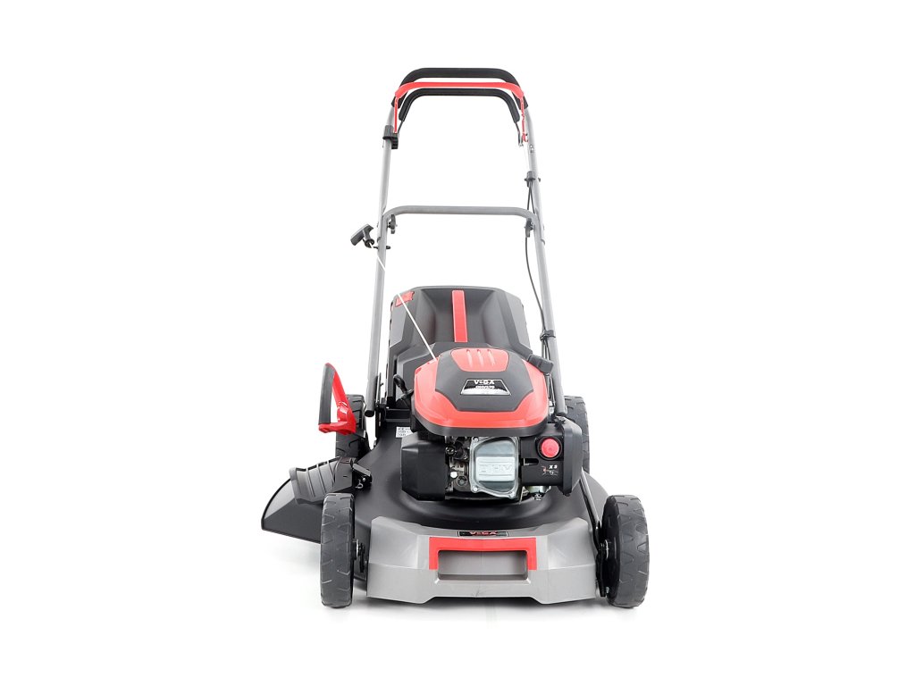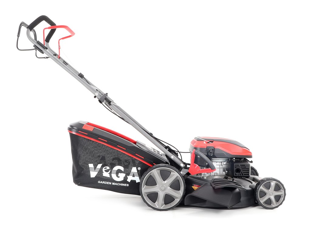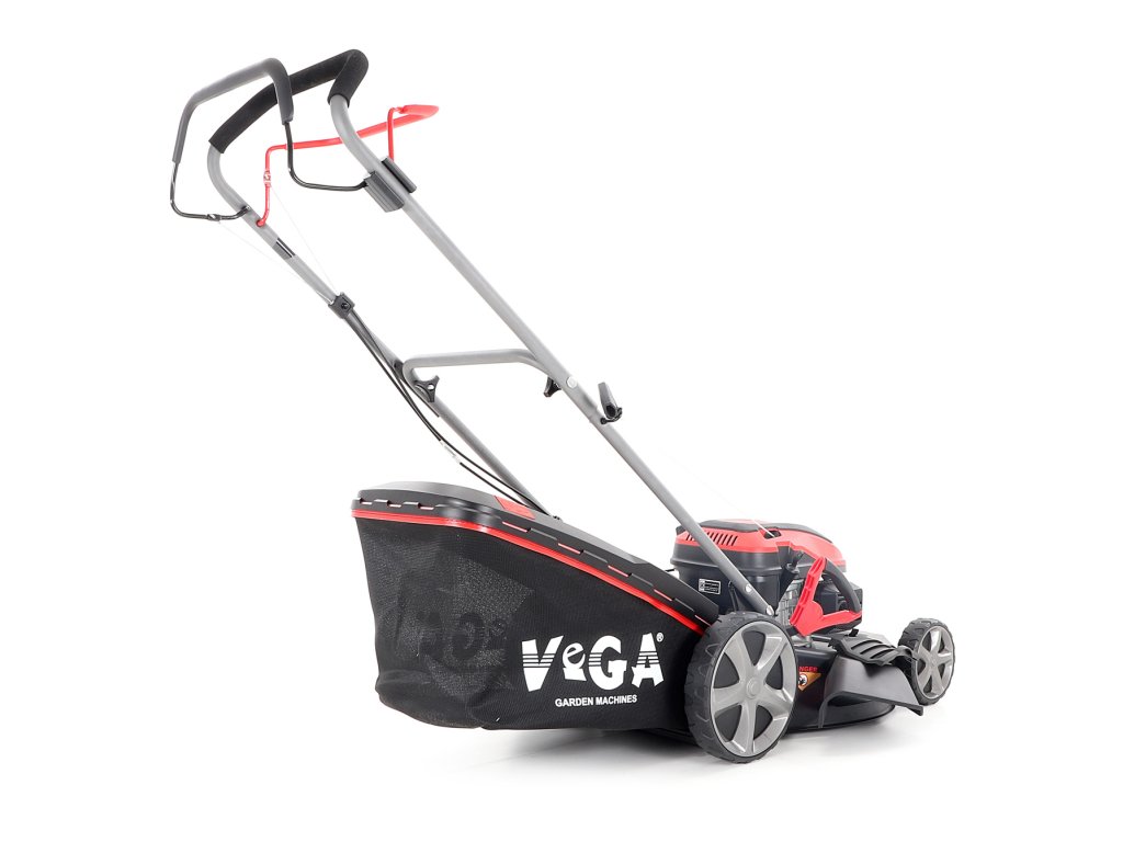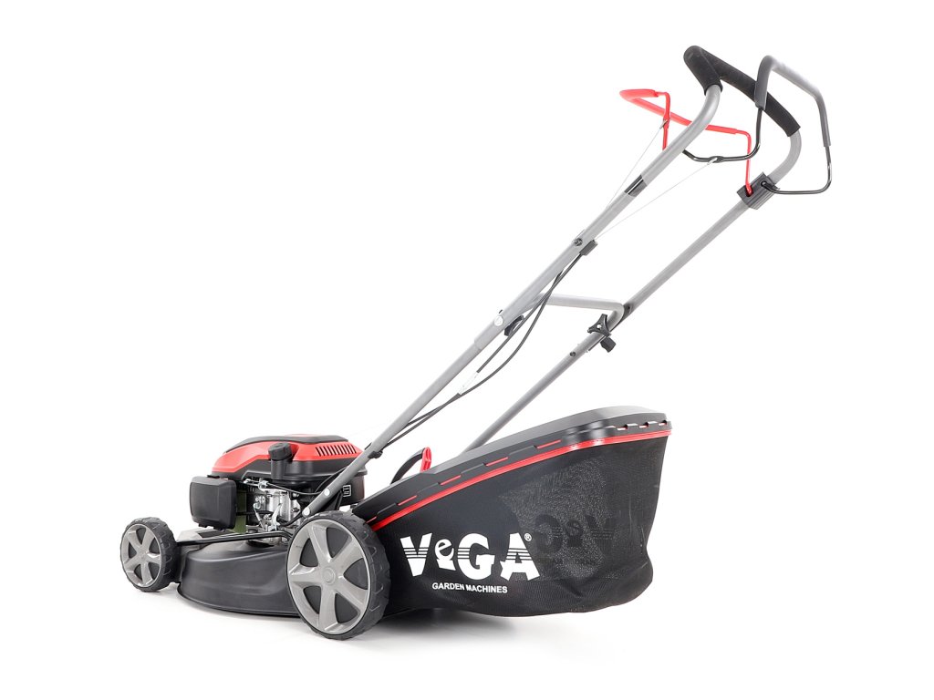 Velká zadní pojezdová kola i přední kola jsou uložena v oboustranných kuličkových ložiscích, centrální nastavení výšky sečení je u značky VeGA také samozřejmostí, jako ergonomické měkčené madlo. Objemný sběrný koš o kapacitě 65 litrů má ukazatel naplnění.