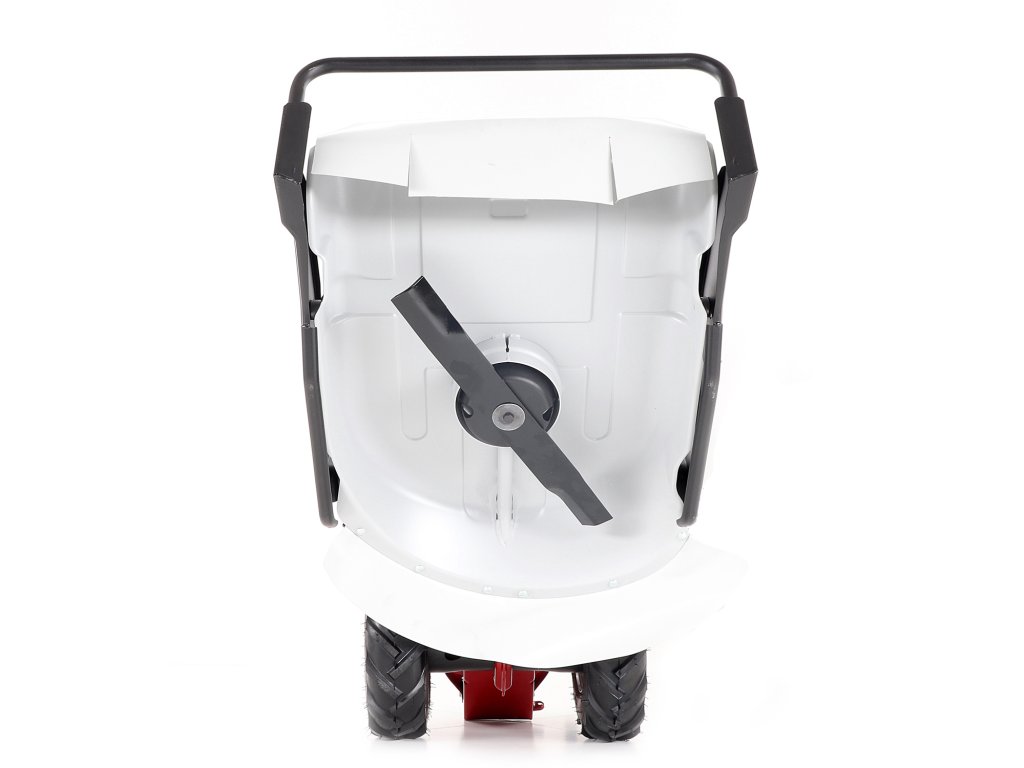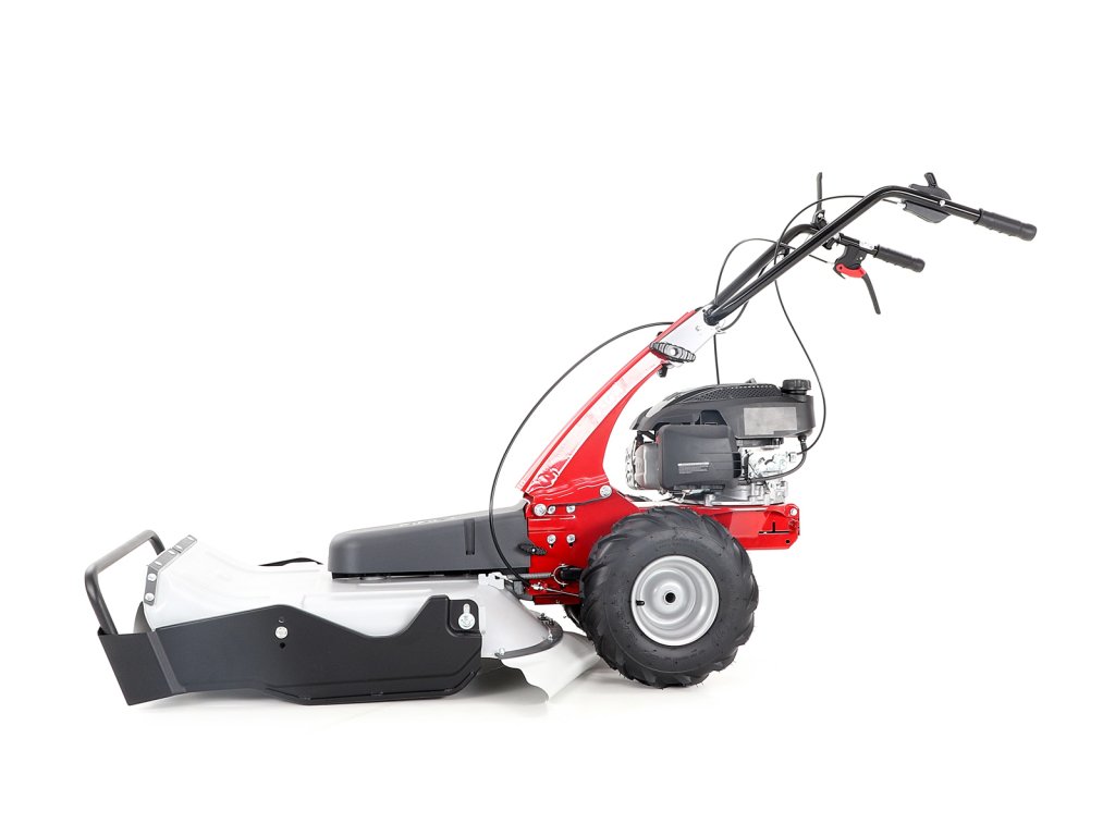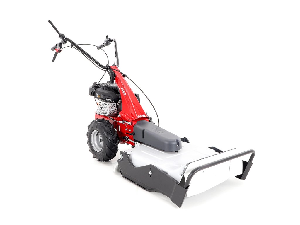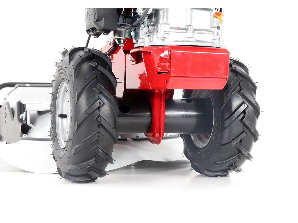 Díky tomu je manipulace se sekačkou pohodlná i v členitém nebo svažitém terénu. Jednostranný pojezdový systém poskytuje vysokou trakci a jistotu při práci ve vysokém porostu.