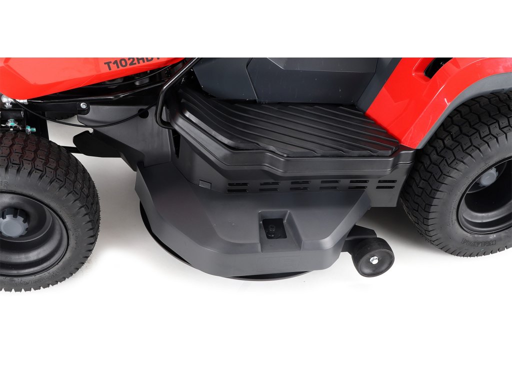 Šířka záběru sečení je úctyhodných 102 cm a sekačka je vybavena dvěma sekacími noži. Zapínání sečení probíhá pohodlně pomocí systému PTO. Výška sečení je nastavitelná v šesti různých polohách od 25 do 80 mm, což umožňuje přizpůsobit se jakémukoliv terénu a typu trávníku. Pro ještě větší flexibilitu je zahradní traktor VeGA T102HDT vybaven funkcí sečení při couvání a mulčovací záslepkou pro ekologické zpracování trávy.